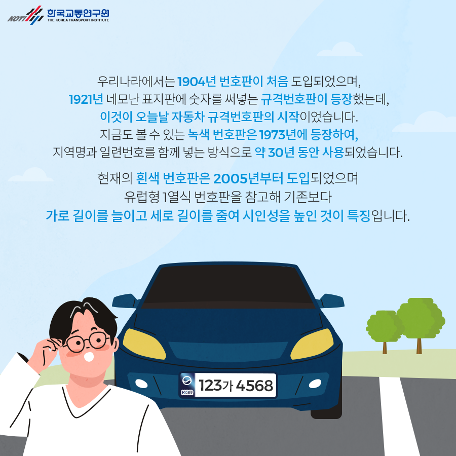 해당 정책은 우리나라에 1904년 처음으로 도입되었으며 1921년 네모난 표지판에 숫자를 넣어 규격번호판이 등장하게 되었습니다.