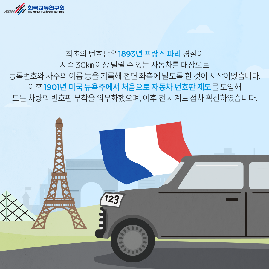 최초의 번호판은 1893년 프랑스 파리 경찰이 시좃 30KM 이상 달릴 스 있는 자동차를 대상으로 번호와 차주의 이름을 기록해 전면부 좌측에 부착하는 것으로 시작했습니다.