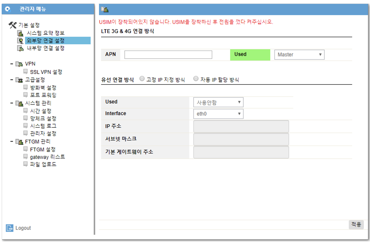 - 외부망 IP 주소 : 현재 외부망으로 설정된 IP 주소.( 없을 경우, “0.0.0.0”으로 표시.
