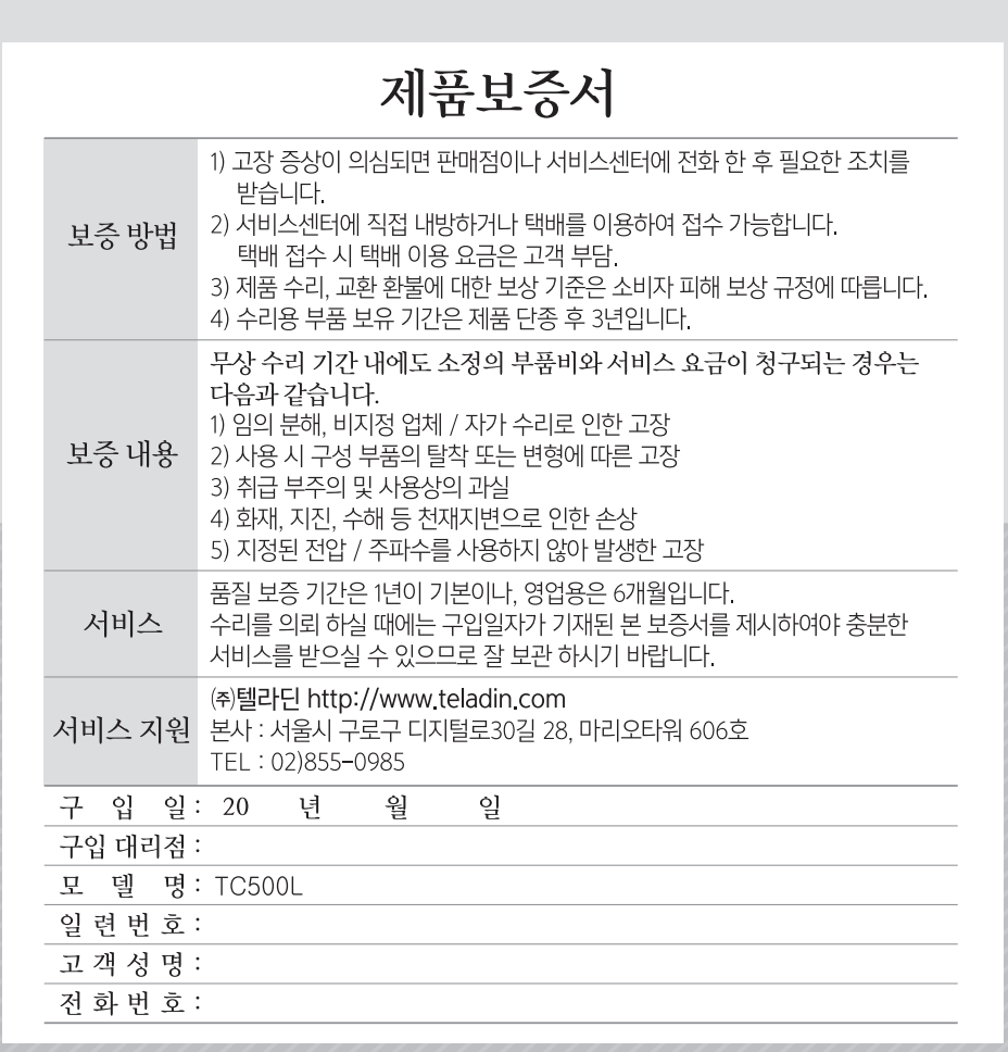 제품의 구매(개통일) 일로부터 1년간 무상 기술지원 및 장비 불량애 대한 무상지원이 가능함으로 제조사에 등록 또는 구매일을 작성하도록 해주세요.